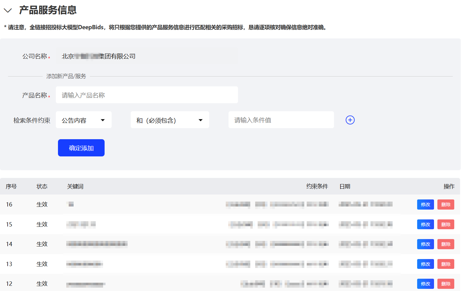 5.1、首次使用前,需完整填写一次DdepBids智能体所需的企业招投标资料,工商基础信息、产品服务信息、资质荣誉信息、商务业务信息、历史业绩信息等,此后DdepBids智能体将根据您提供的信息,将您的招投标工作全链路交给Ai智能体。